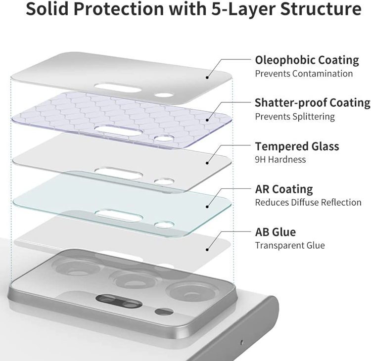 ROBUST SKYDD: Mobiltelefonkameraskärmskydd med oleofobisk beläggning, splittringssäker beläggning, AR-beläggning, AB-lim och 9H-härdat glas visar hög hållbarhet för hög upplösning och skadeskydd.