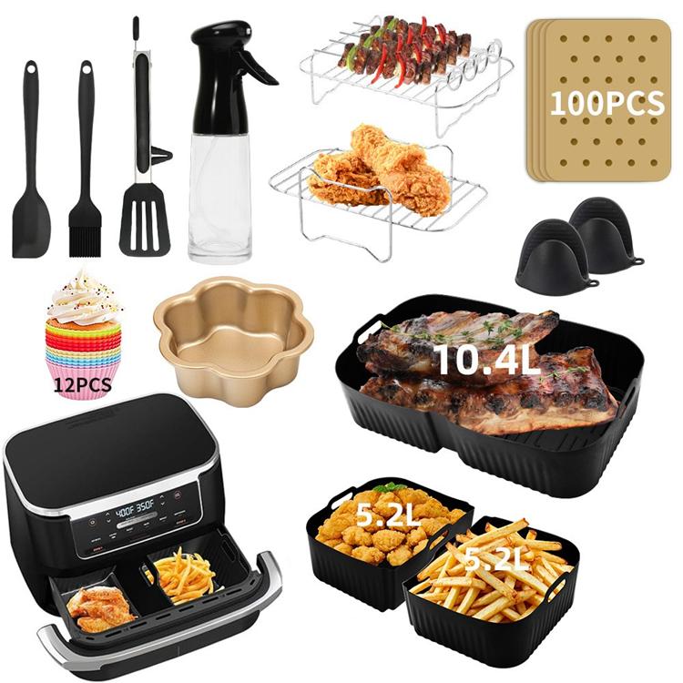 Detta tillbehörsset för Ninja AF500 Air Fryer är skapat för dig som vill få ut det mesta av din airfryer – från saftiga grillrätter till perfekta bakverk. Setet innehåller silikonbrickor, grillgaller, oljeflaska, pensel, skrapa, cupcakeformar, oljepapper, matklämmor och mycket mer, så att du kan laga allt från frasiga pommes till muffins och kycklingvingar. Alla delar är tillverkade av livsmedelsklassad, BPA-fri och FDA-certifierad silikon som tål höga temperaturer och är helt säker för matlagning.