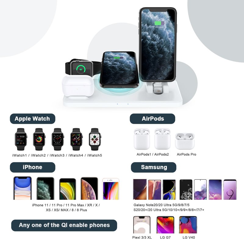 - Trådlös laddning: Ger 15W trådlös laddning för mobiltelefoner och laddar även Bluetooth-hörlurar och Apple Watch.