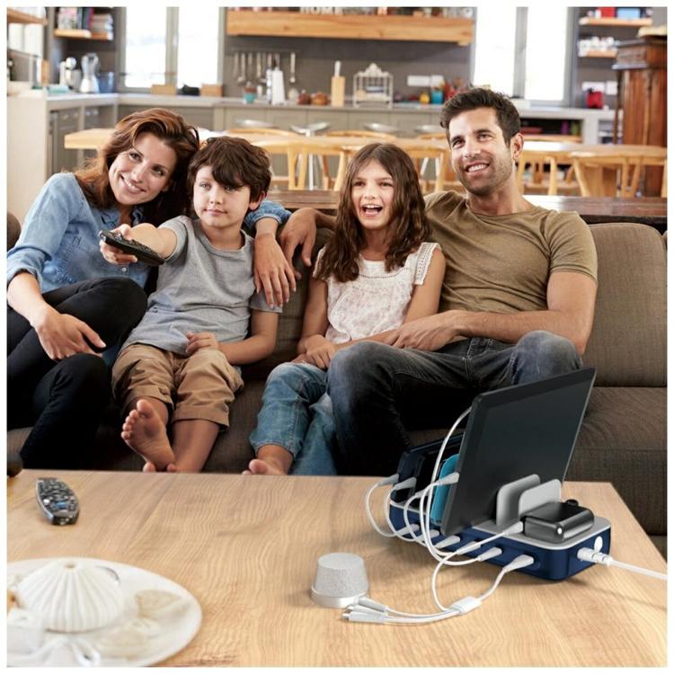 Den intelligenta effektfördelningen optimerar laddningen för varje ansluten enhet – vare sig det gäller smartphones, surfplattor, hörlurar, powerbanks eller handhållna spelkonsoler. Den eleganta designen i mörkblått gör sig lika bra på skrivbordet som i vardagsrummet. En anti-glidbas och integrerad kabelhantering håller ordning och stabilitet.