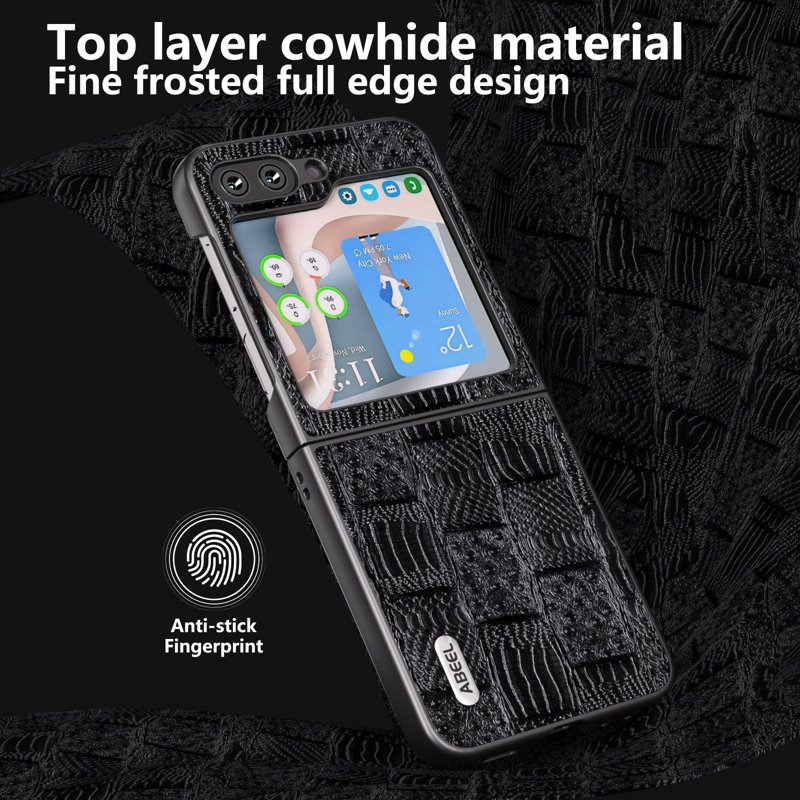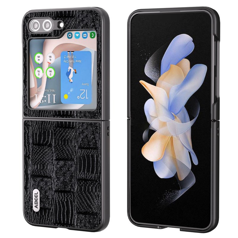 ABEEL Galaxy Z Flip5 Mobilskal Mahjong Textur Äkta Läder Svart