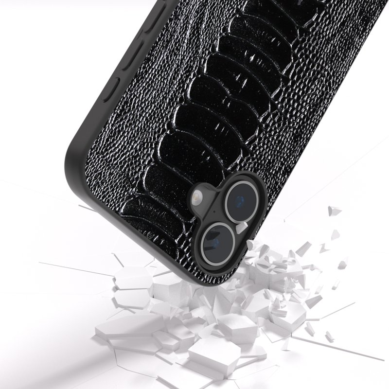 Detta mobilskal kombinerar stil och funktionalitet. Tillverkat av högkvalitativt äkta läder ger det en lyxig känsla. Med sin krokodilstruktur och svarta kant är det både elegant och praktiskt. Skyddet är omfattande och passar perfekt för din telefon.