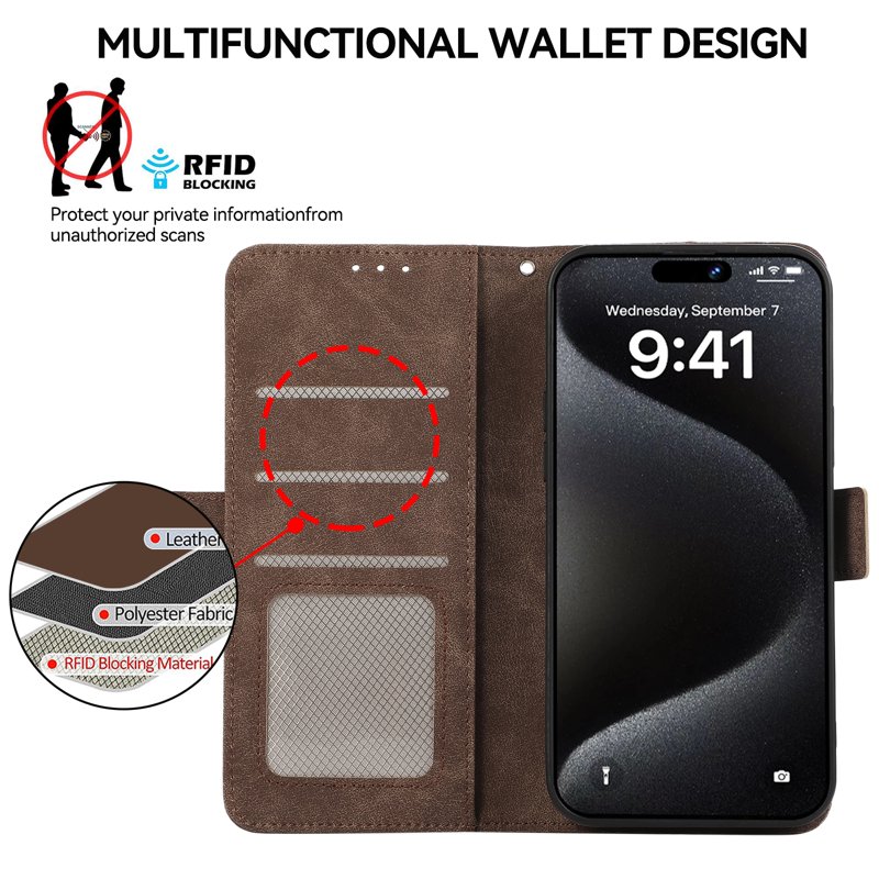 Denna plånboksfodral är tillverkat av PU-läder och TPU. Det erbjuder ett komplett skydd mot slitage, repor och skador. Med smarta funktioner och RFID-säkerhet skyddar det även din personliga information. Perfekt för den moderna användaren som värdesätter både stil och funktionalitet.