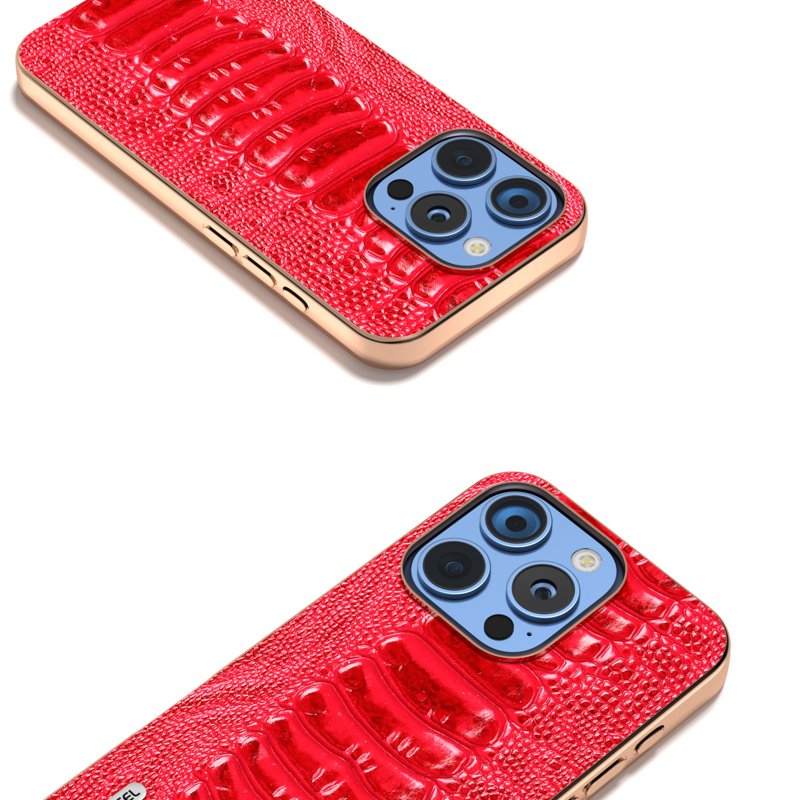 Skydda din telefon med stil. Detta fodral är tillverkat av äkta läder med krokodilstruktur och erbjuder både elegans och funktionalitet. Med sina elektropläterade kanter och noggrant utformade utskärningar får du ett fodral som inte bara ser bra ut utan också skyddar din enhet effektivt.