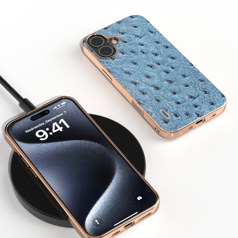 Detta mobilskal kombinerar stil och funktionalitet. Tillverkat av högkvalitativt äkta läder, TPU och PC-material, erbjuder det överlägsen hållbarhet. Med sin unika strutsstruktur och elektropläterade kanter ger det en lyxig känsla samtidigt som det skyddar din telefon på bästa sätt.