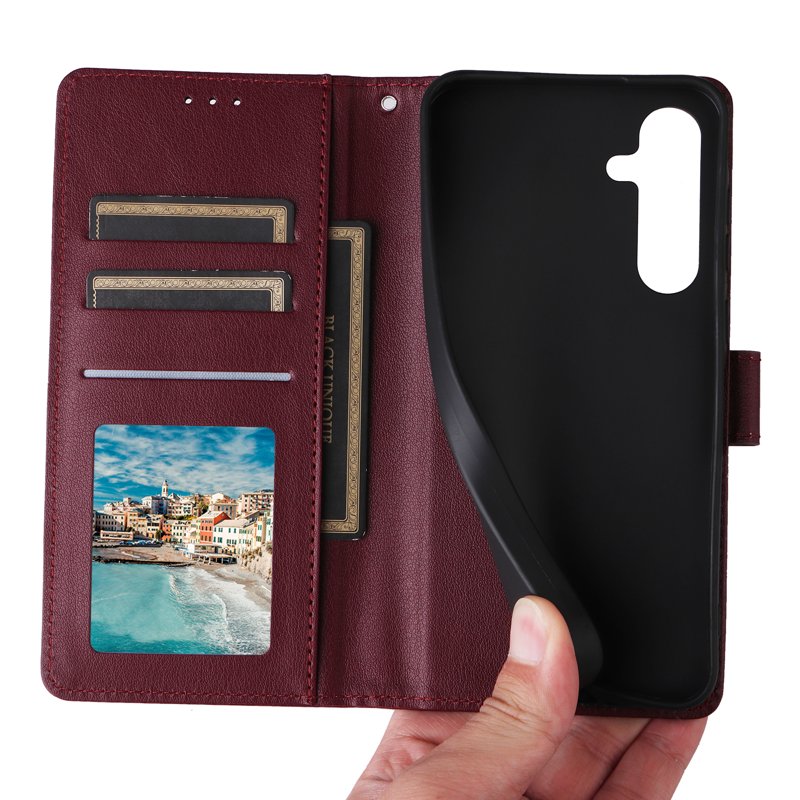 Skydda din Samsung Galaxy A55 5G med detta eleganta och funktionella PU Leather Wallet Cover. Den vinröda färgen ger en stilren look, medan de praktiska funktionerna gör det enkelt att organisera dina kort och kontanter. Perfekt för den moderna användaren som värdesätter både stil och funktionalitet.