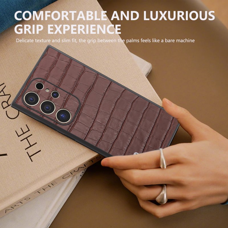 Detta mobilskal kombinerar stil och funktionalitet. Tillverkat av äkta nötläder och PC-material, ger det ett lyxigt grepp och skyddar din telefon mot dagligt slitage. Med sin krokodiltextur är det perfekt för den som vill sticka ut.
