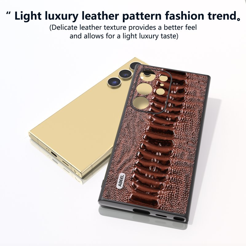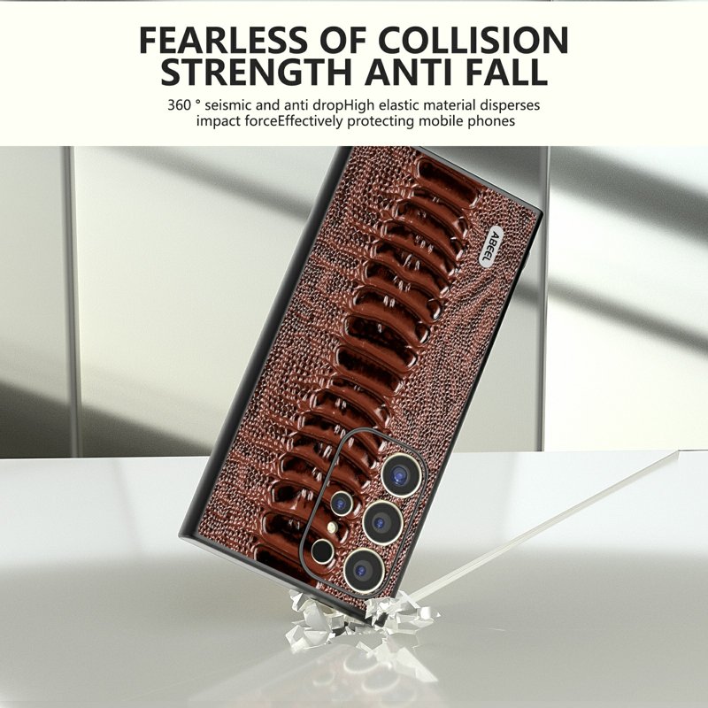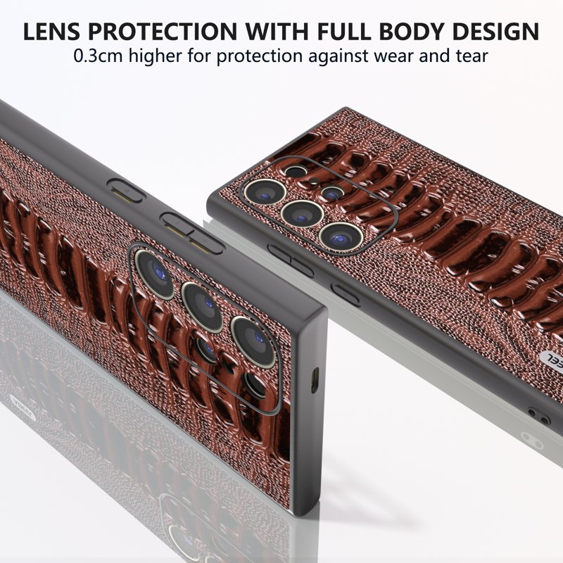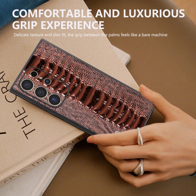 Denna mobilskal är tillverkat av äkta nötköttsläder och TPU, vilket ger en hållbar och stilren lösning för din telefon. Med en krokodiltexturerad yta ser det både modernt och elegant ut. Det skyddar din enhet mot repor och slitage, samtidigt som det ger enkel åtkomst till alla funktioner.