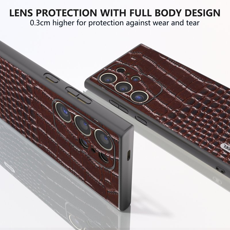 Detta mobilskal kombinerar premium hantverk med stil och funktionalitet. Tillverkat av äkta nötläder och PC-material, erbjuder det ett lyxigt grepp och skydd mot dagligt slitage. Perfekt för den som vill ha både elegans och hållbarhet.