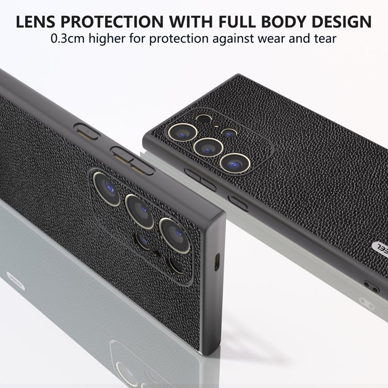 Denna mobilskal kombinerar hållbarhet och elegans. Tillverkat av hård PC och äkta nötläder, erbjuder det överlägsen skydd mot repor och stötar. Med en stilren litchi-textur ger det en behaglig känsla och ett modernt utseende. Perfekt för den som vill ha både funktion och stil.