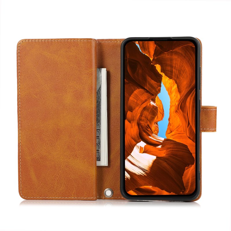 - Hållbar skydd: Tillverkad av slitstark split-läder och TPU-material, skyddar detta flip-fodral din telefon mot repor, fall och stötar.