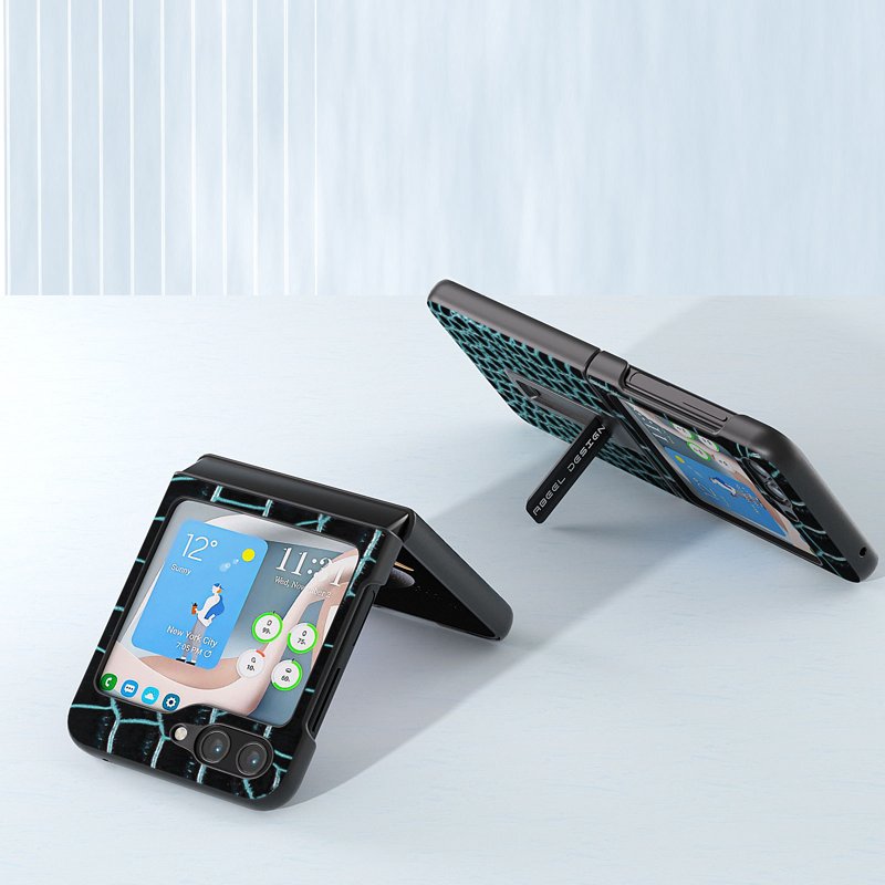 Detta fodral är tillverkat av äkta nötköttsläder och har en hård PC-inre. Det är både hållbart och stiligt. Med sin unika krokodiltextur ger det en modern känsla. Det är designat för att skydda din telefon utan att påverka dess funktioner.