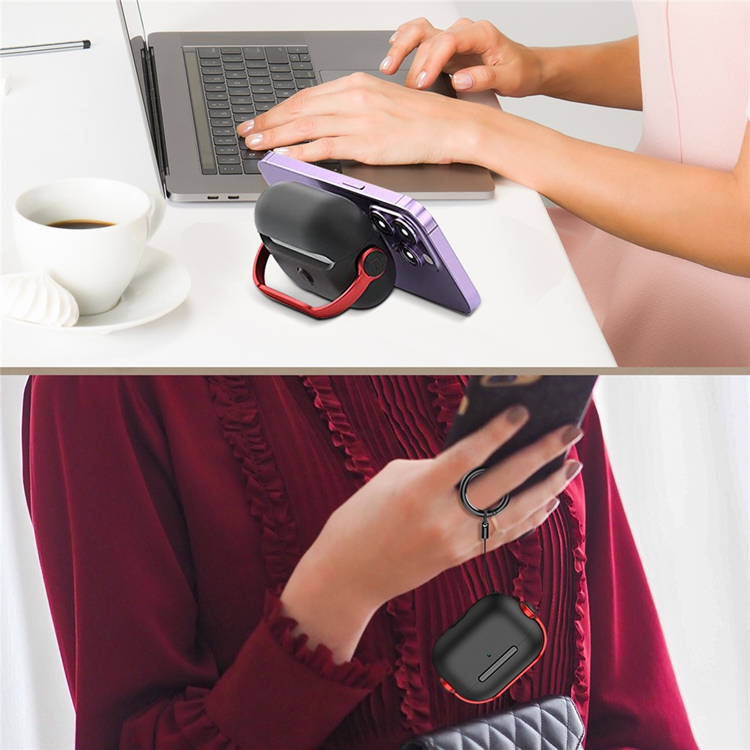 Det inbyggda metallstativet fungerar både som ett praktiskt stöd och ett smidigt bärhandtag, vilket gör skalet lika funktionellt som elegant. Tack vare stödet för både trådbunden och trådlös laddning behöver du aldrig ta av skalet. Medföljer gör även en löstagbar snodd och metallring som gör det enkelt att fästa skalet på väska, nycklar eller bälte.
