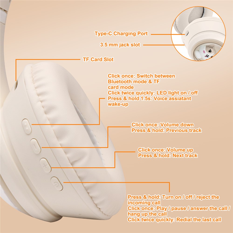 Med den senaste Bluetooth 5.3-tekniken får du stabil, snabb och störningsfri anslutning till dina enheter. De kraftfulla 40 mm HiFi-högtalarna levererar ett dynamiskt stereoljud med fyllig bas och klara detaljer för en engagerande lyssningsupplevelse. Den söta kattörondes design med färgskiftande RGB-ljus gör hörlurarna till ett blickfång – både trendiga och roliga att bära.