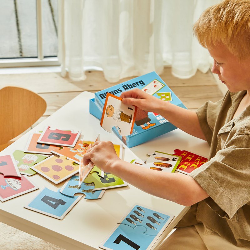 Den här underbara pusselboxen "Fun With Math" är utformad för att introducera små barn till grundläggande matematiska begrepp genom lek. Den innehåller 10 minipussel med den älskade karaktären Alfons Åberg, vilket gör inlärningen både rolig och engagerande. Varje pusselbit har siffror och motiv på båda sidor, vilket hjälper barnen att förstå enkla beräkningar. Till exempel visar ett pussel siffran 4 på ena sidan och en illustration av 4 katter på den andra, vilket uppmuntrar barn att matcha siffror med motsvarande bilder.