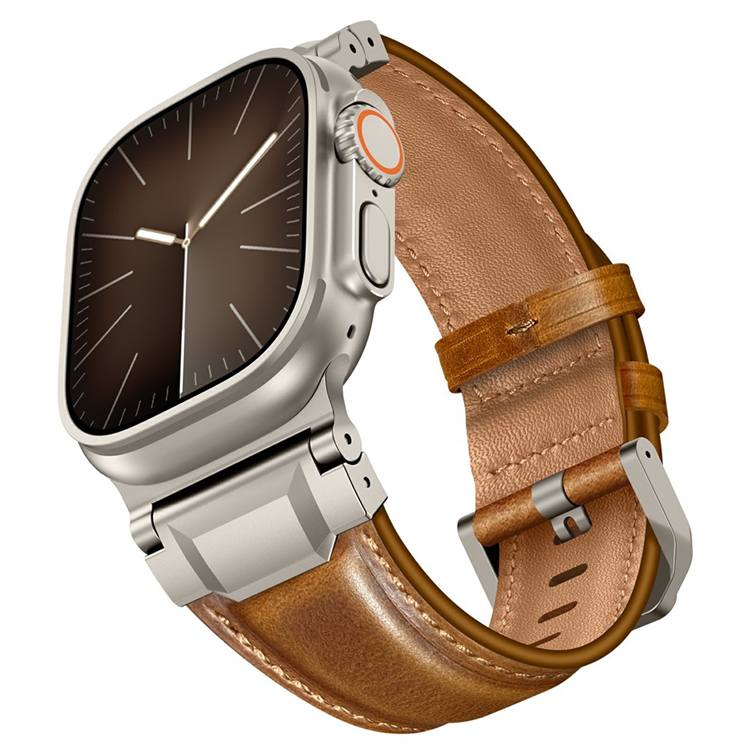 Apple Watch (42/44/45/46/49mm) Armband Cowhide Läder med Stainless Steel Connector - Brun/Titanium