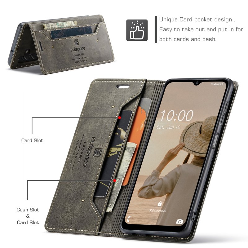 Upptäck AUTSPACE A01 Flip Leather Fodral för Samsung Galaxy A14. Detta fodral kombinerar stil och funktionalitet. Med högkvalitativt PU-läder och en mjuk TPU-inre del erbjuder det både skydd och elegans. Perfekt för den moderna användaren som värdesätter både design och säkerhet.