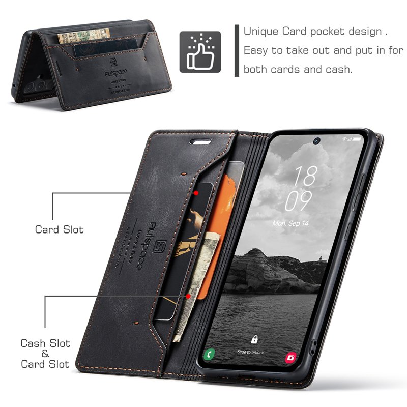 Upptäck AUTSPACE A01 fodralet för Samsung Galaxy A55 5G. Detta eleganta fodral är tillverkat av äkta läder och erbjuder både stil och skydd. Med funktioner som RFID-blockering och en praktisk kortficka är detta fodral det perfekta valet för den moderna användaren.