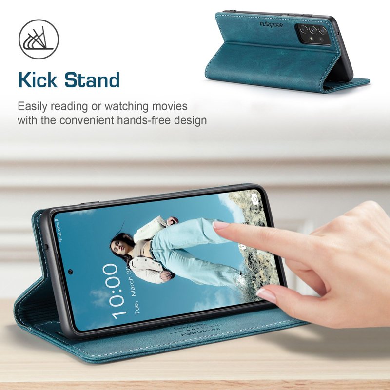 Upptäck AUTSPACE A01 Fodral för Samsung Galaxy A72 i stilren blå färg. Detta fodral kombinerar premium PU-läder med en mjuk TPU-inre del för en behaglig känsla. Med RFID-blockering skyddar det din personliga information. Fodralet är både funktionellt och elegant, perfekt för den moderna användaren.