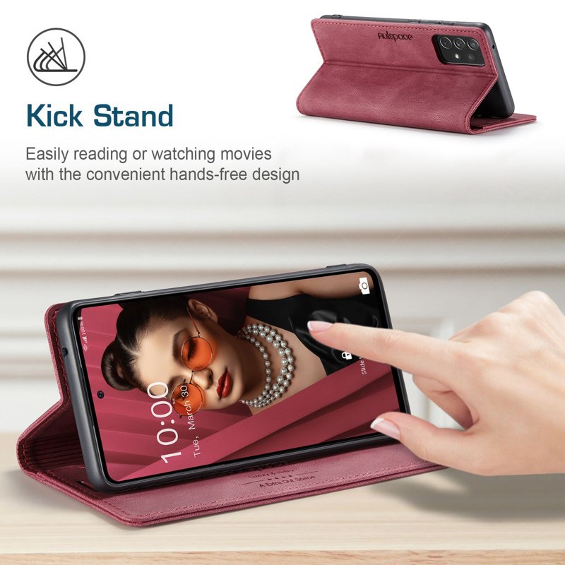 Upptäck AUTSPACE A01 fodralet för Samsung Galaxy A72. Detta eleganta fodral i PU-läder kombinerar stil och funktionalitet. Med sin RFID-blockering skyddar det din personliga information. Fodralet erbjuder också praktiska funktioner som kortfack och en ställfunktion för handsfree-användning.