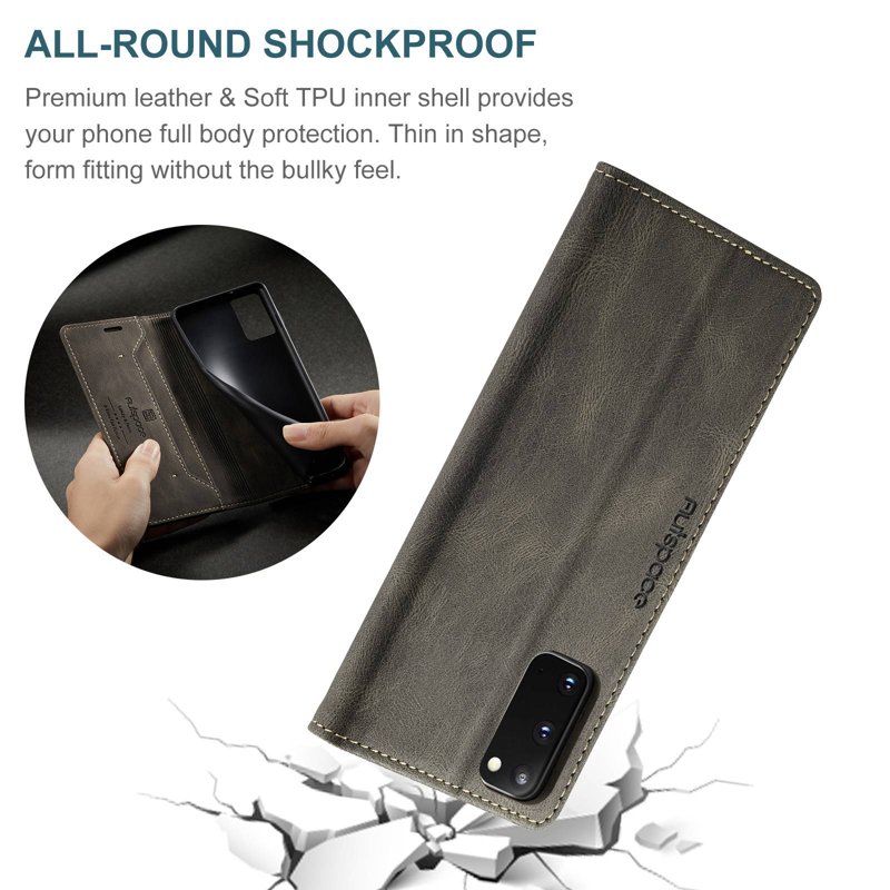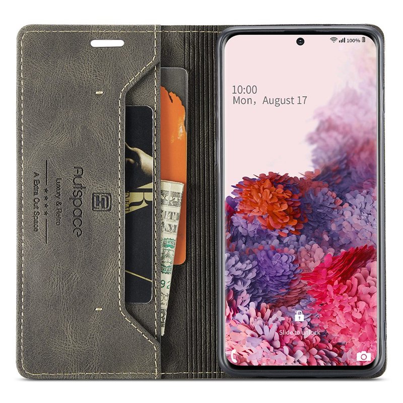 Upptäck AUTSPACE A01 fodral för Samsung Galaxy S20. Detta eleganta fodral i PU-läder kombinerar stil och funktionalitet. Med sin RFID-blockeringsteknik skyddar det din personliga information. Fodralet erbjuder också praktiska funktioner som kortfack och en ställfunktion för handsfree-visning. Perfekt för den moderna användaren.