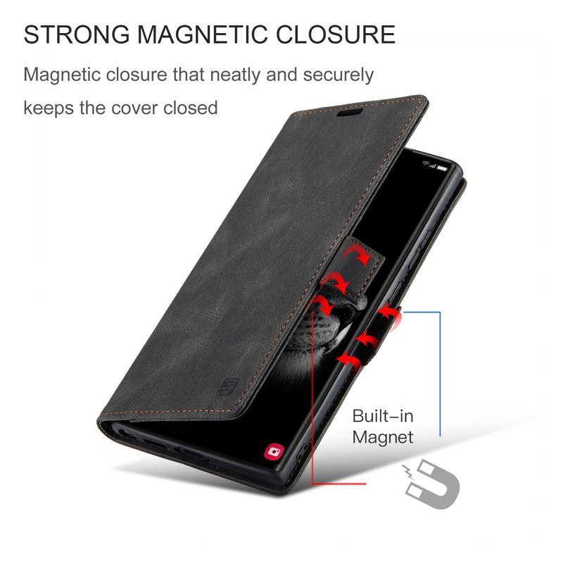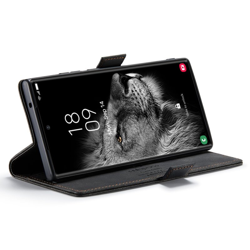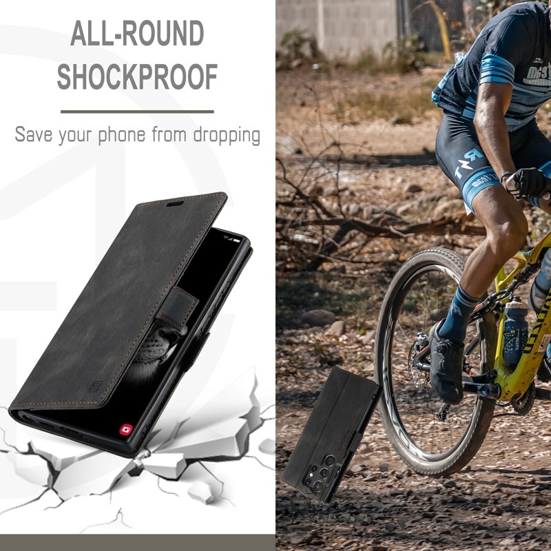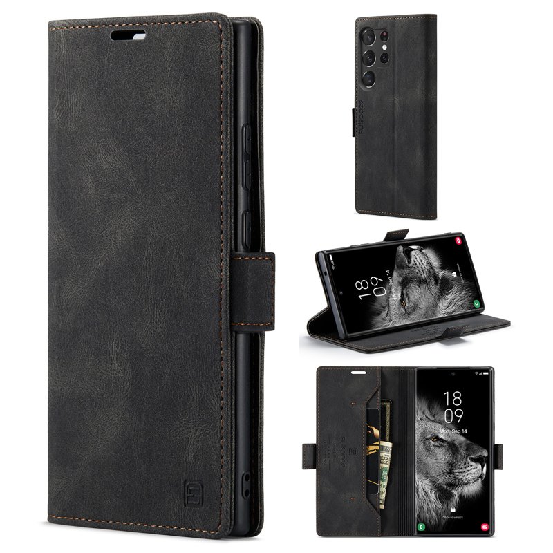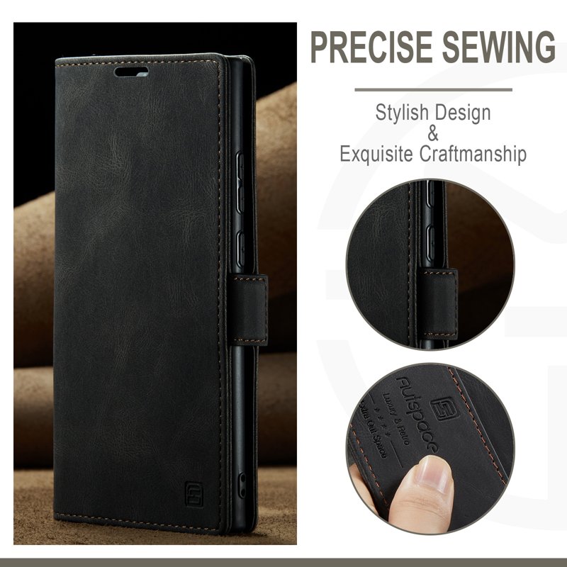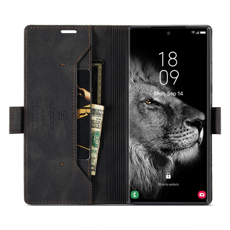 Upptäck AUTSPACE A01 fodralet för Samsung Galaxy S23 Ultra. Detta eleganta fodral i äkta läder kombinerar stil och funktionalitet. Med sin RFID-blockeringsteknik skyddar det din personliga information. Den praktiska designen med kortfack gör det enkelt att ha allt du behöver på ett ställe.