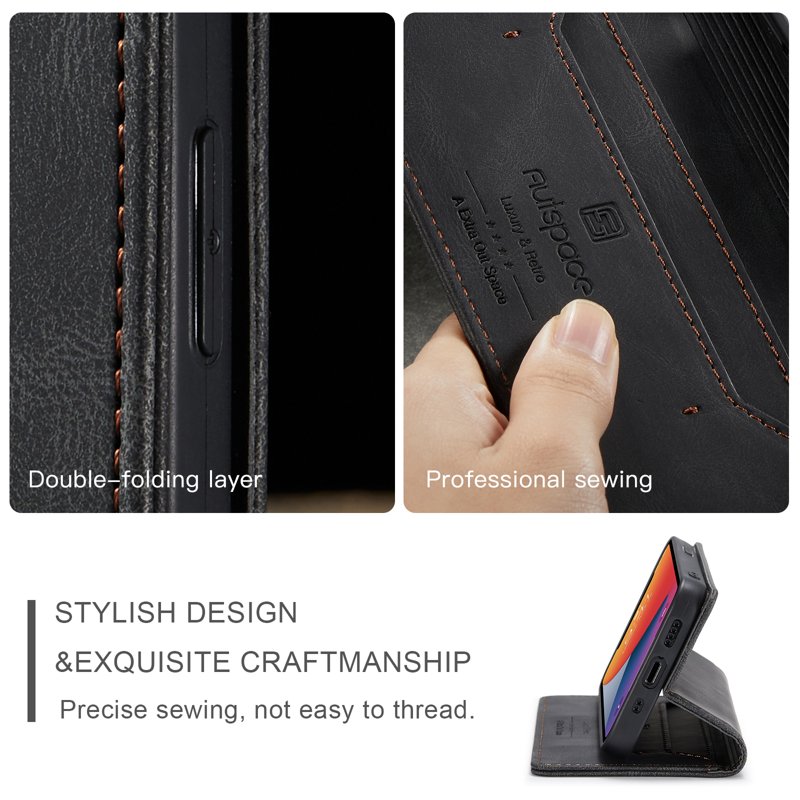 Skydda din iPhone 12 mini med AUTSPACE A01 skal i äkta läder. Detta skal kombinerar stil och funktionalitet. Med premium PU-läder och en mjuk TPU-inre del får din telefon ett komplett skydd. Dessutom erbjuder det smarta funktioner som RFID-blockering och en praktisk kortficka.