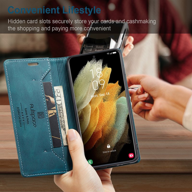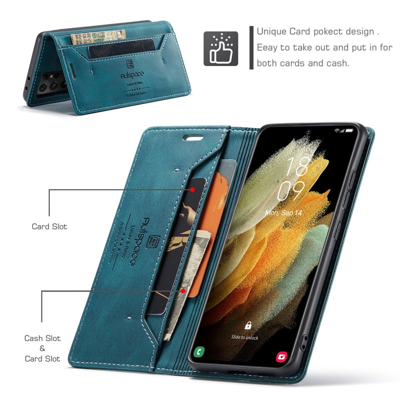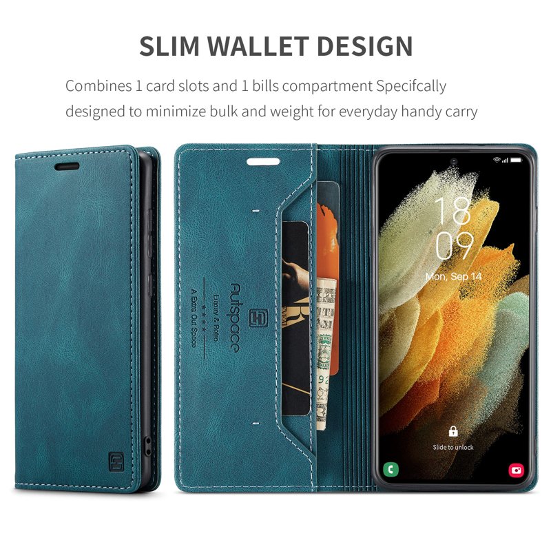 Skydda din Samsung Galaxy S21 Ultra med AUTSPACE A01 fodral i äkta läder. Detta fodral kombinerar stil och funktionalitet. Med högkvalitativt material och smart design erbjuder det ett komplett skydd för din telefon. Perfekt för den moderna användaren som värdesätter både säkerhet och bekvämlighet.