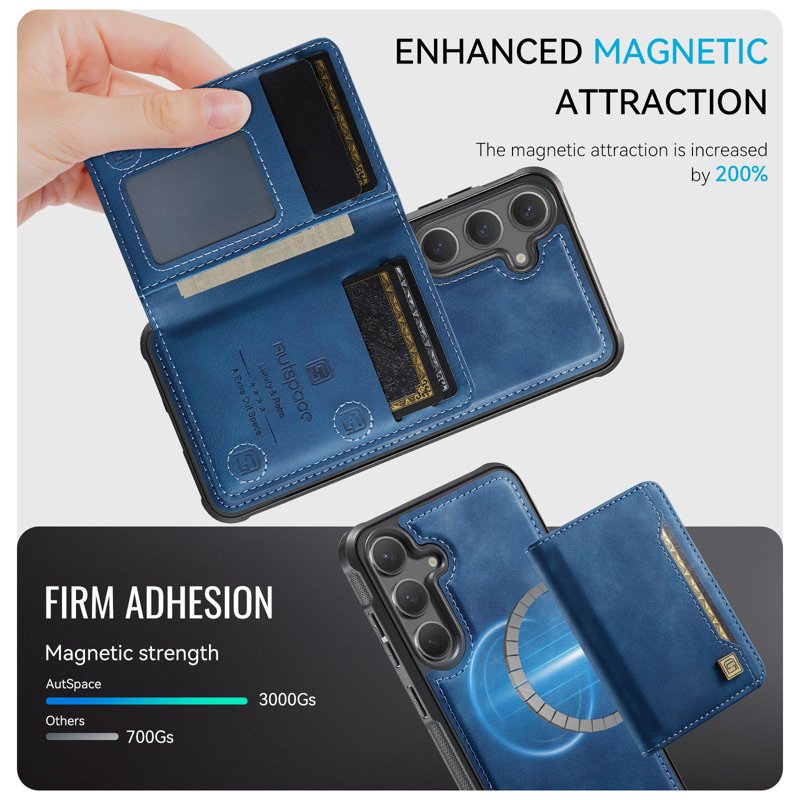 Upptäck AUTSPACE Fodral för Samsung Galaxy S24/S25. Detta fodral i äkta läder kombinerar stil och funktionalitet. Med en magnetisk avtagbar design och flera kortfack är det perfekt för den moderna användaren. Skydda din telefon med stil och håll dina viktigaste kort nära till hands.