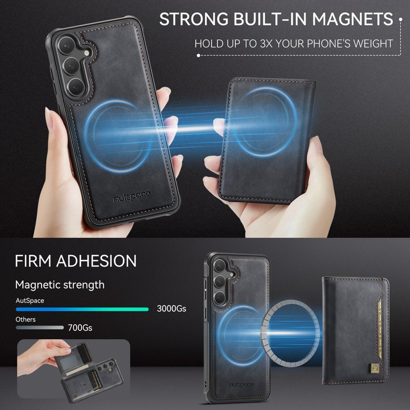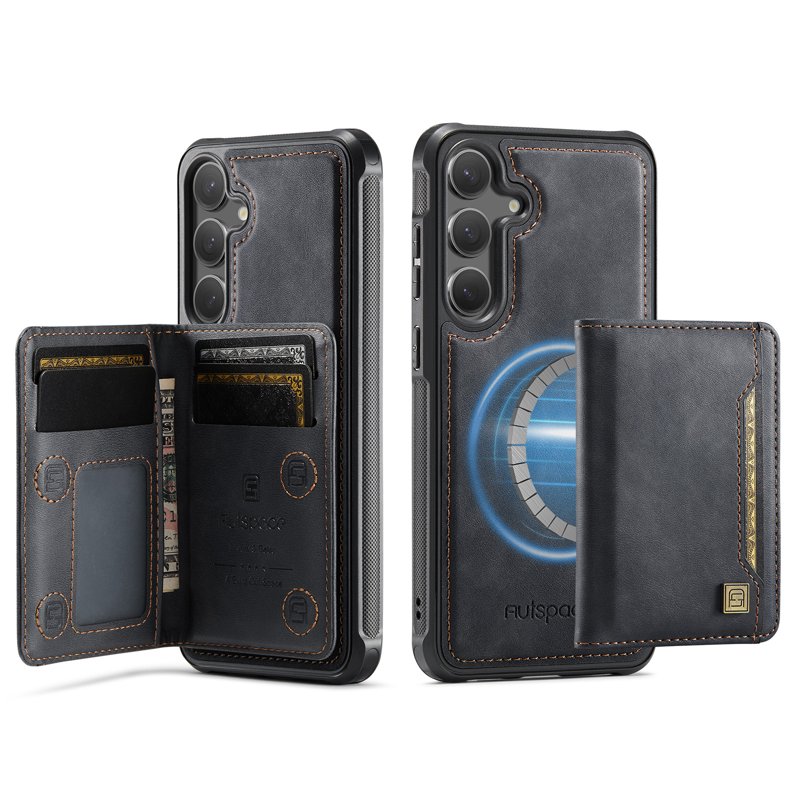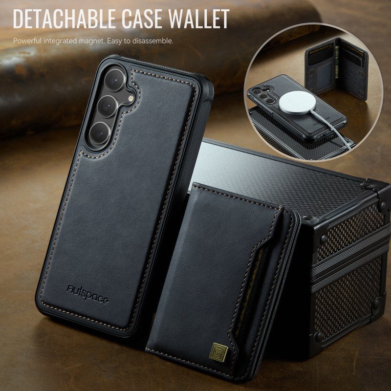 Upptäck AUTSPACE Samsung Galaxy S24/S25 fodral i äkta läder. Detta fodral kombinerar stil och funktionalitet. Med sin magnetiska avtagbara design och flera kortfack är det perfekt för den moderna användaren. Skydda din telefon samtidigt som du har allt du behöver nära till hands.