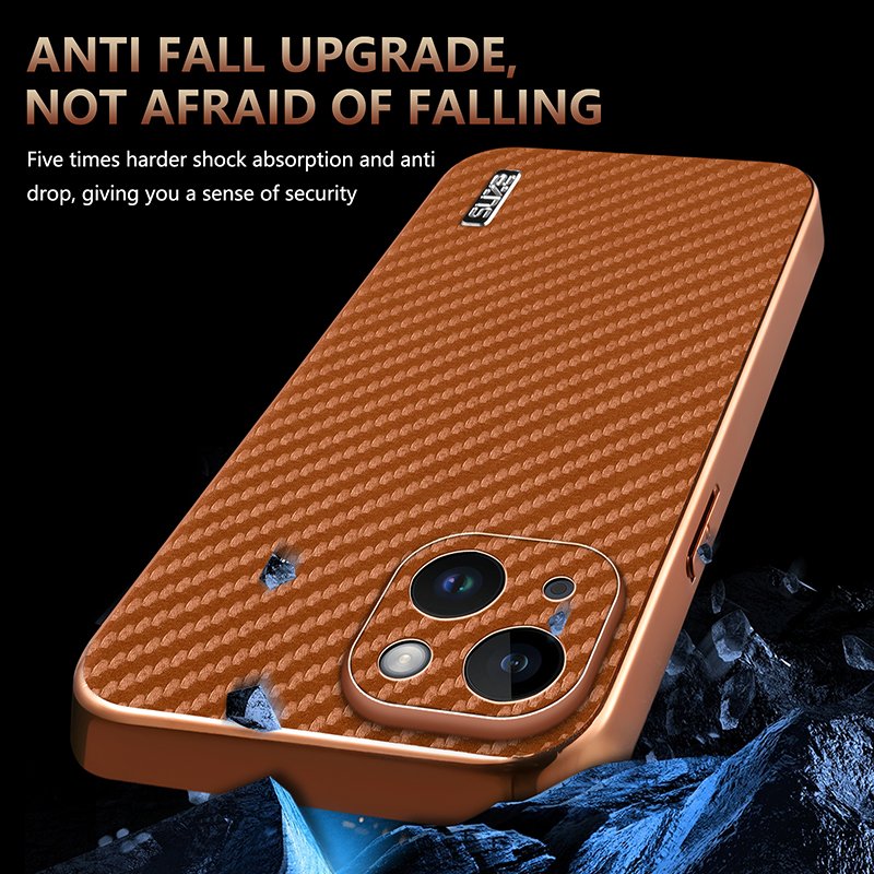 Upptäck AZNS iPhone 15 Fodral Electroplating Carbon Fiber PU+TPU i brun. Detta fodral kombinerar stil och funktionalitet. Med en elegant kolfiberdesign och högkvalitativa material skyddar det din enhet samtidigt som det ger ett sofistikerat utseende.