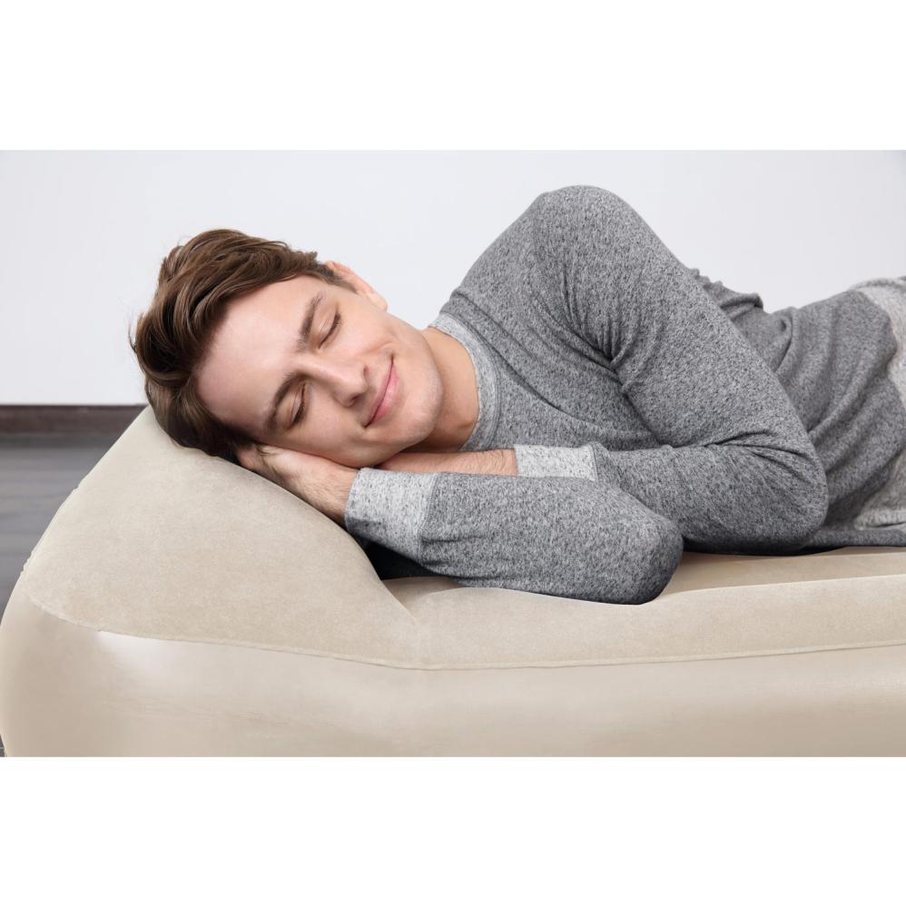 Den inbyggda AC-luftpumpen blåser upp madrassen på 2-3 minuter, så att den är redo att användas när du är redo. På morgonen möjliggör en snabb avluftningsskruvventil enkel avluftning. Placera helt enkelt din platta säng i den medföljande bärväskan för enkel transport och förvaring.
