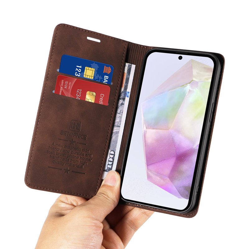 BETOPNICE 003 för Samsung Galaxy A56 5G är ett stilrent fodral i äkta läder. Det erbjuder ett komplett skydd för din telefon och har flera funktioner som gör det både praktiskt och säkert. Med detta fodral kan du enkelt skydda din enhet samtidigt som du har dina viktigaste kort och kontanter nära till hands.