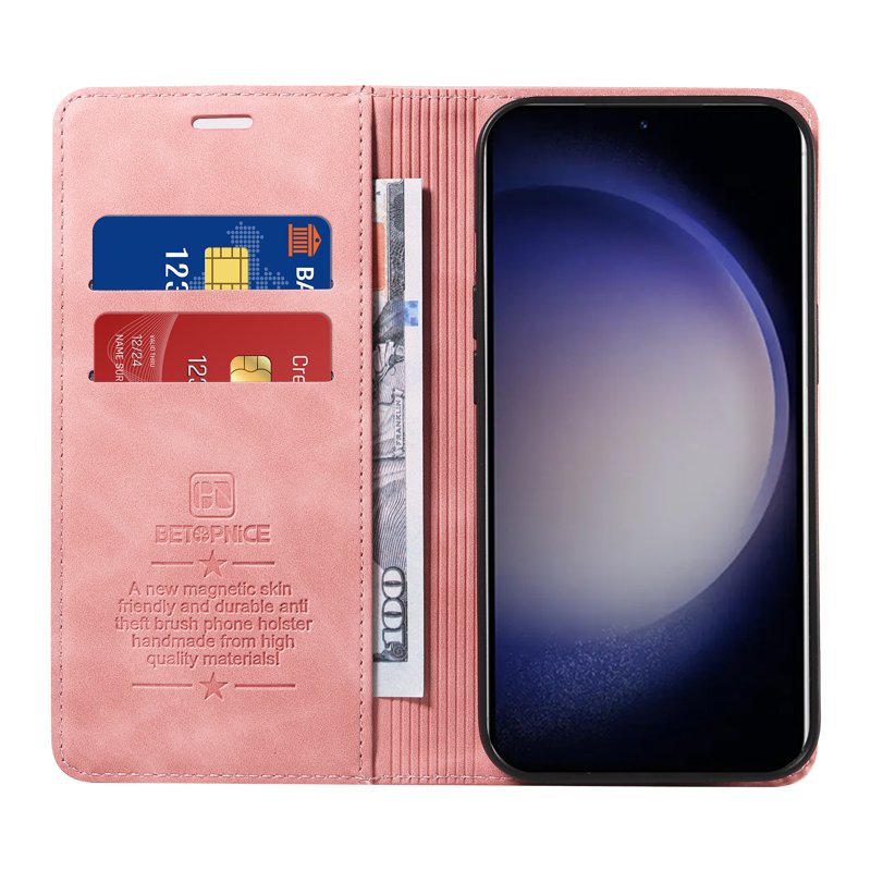 BETOPNICE 003 för Samsung Galaxy S25+ är ett stiligt och funktionellt plånboksfodral i äkta läder. Det erbjuder ett komplett skydd för din telefon samtidigt som det är praktiskt för att förvara dina kort och kontanter. Med sin eleganta rosa färg är det både snyggt och säkert.