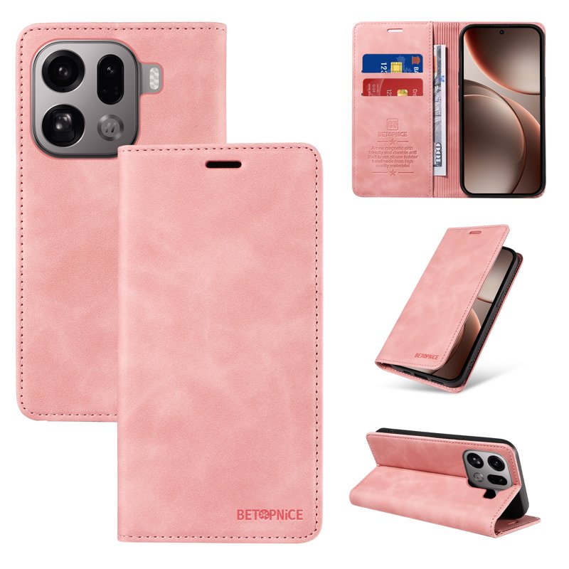 BETOPNICE Magnetisk Stängning RFID-blockerande Plånboksfodral för Oppo Find X9 Pro 5G erbjuder ett komplett skydd och funktionalitet. Detta fodral kombinerar stil och säkerhet med en elegant design i rosa. Skydda din telefon och dina kort med detta praktiska och snygga fodral.