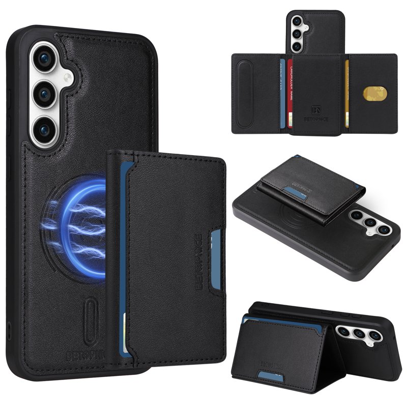 Upptäck BETOPNICE Samsung Galaxy S23 FE fodral i äkta läder. Detta fodral kombinerar stil och funktionalitet. Med avancerad RFID-skyddsteknik och en praktisk design är det det perfekta valet för att skydda din telefon och dina kort. Njut av bekvämligheten av MagSafe-kompatibilitet och en kickstand-funktion för handsfree-användning.