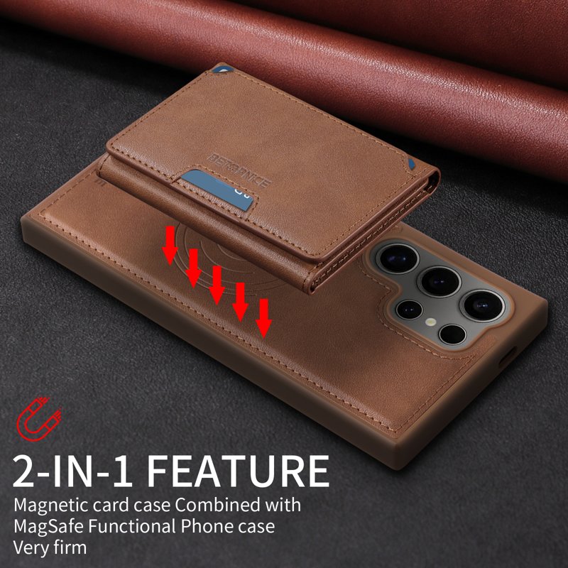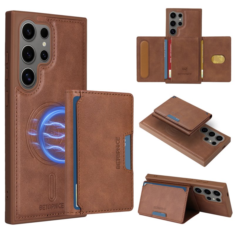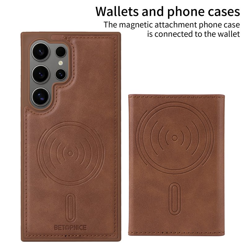 BETOPNICE Samsung Galaxy S24 Ultra Fodral i äkta läder är den perfekta lösningen för dig som vill kombinera stil och funktionalitet. Med sin bruna färg och smarta design erbjuder detta fodral både skydd och praktiska funktioner. Det är en idealisk ersättning för din traditionella plånbok och ger dig möjlighet att hålla allt du behöver på ett ställe.