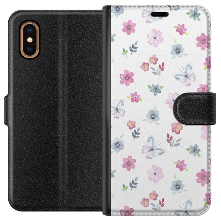 Plånboksfodral för iPhone XS Max med Blommor och fjärillar -design. Fodralet kombinerar stil och funktion – ett slitstarkt mobilskal som skyddar mot repor och stötar samt praktiska kortfack på insidan.