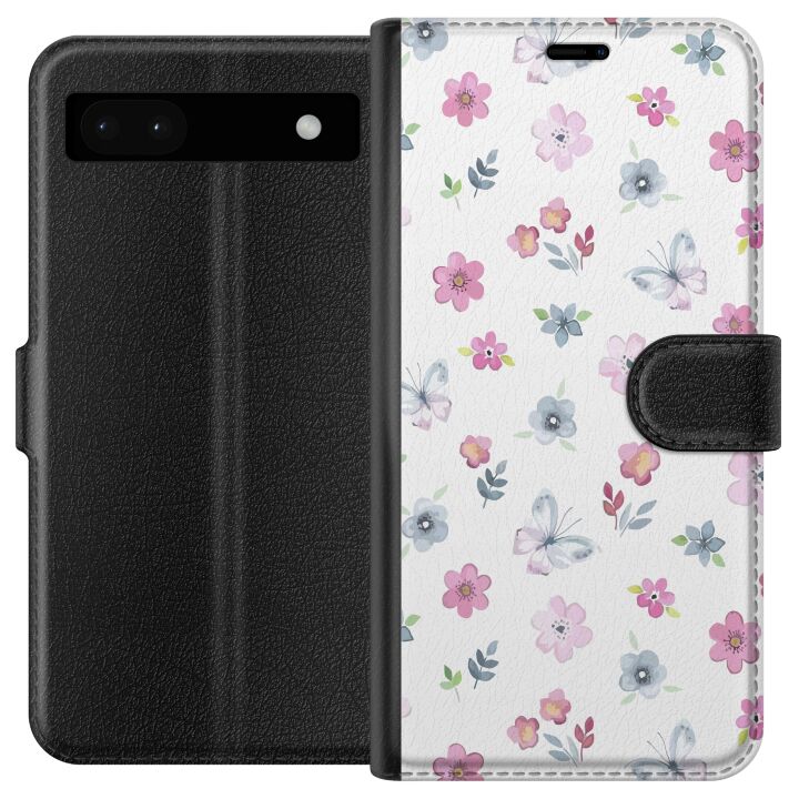 Plånboksfodral för Pixel 6a med Blommor och fjärillar -design. Fodralet kombinerar stil och funktion – ett slitstarkt mobilskal som skyddar mot repor och stötar samt praktiska kortfack på insidan.