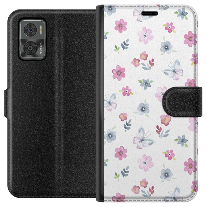 Plånboksfodral för Moto E22i med Blommor och fjärillar -design. Fodralet kombinerar stil och funktion – ett slitstarkt mobilskal som skyddar mot repor och stötar samt praktiska kortfack på insidan.