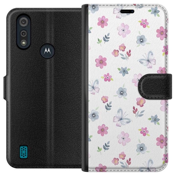 Plånboksfodral för Moto E6i med Blommor och fjärillar -design. Fodralet kombinerar stil och funktion – ett slitstarkt mobilskal som skyddar mot repor och stötar samt praktiska kortfack på insidan.