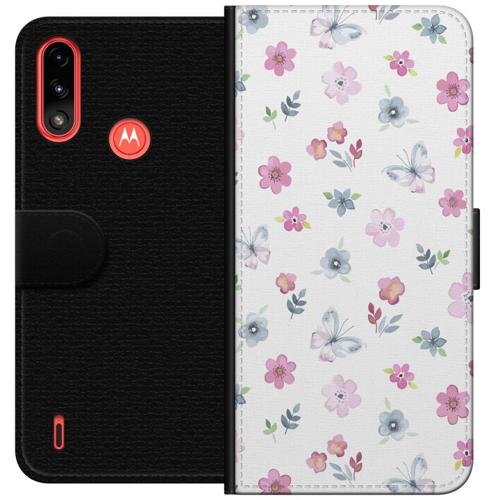 Plånboksfodral för Moto E7 Power med Blommor och fjärillar -design. Fodralet kombinerar stil och funktion – ett slitstarkt mobilskal som skyddar mot repor och stötar samt praktiska kortfack på insidan.