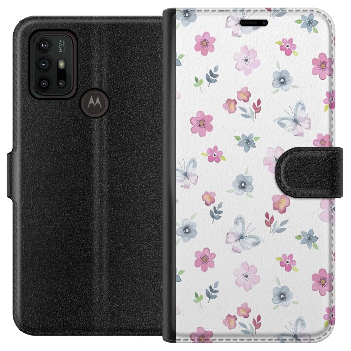 Plånboksfodral för Moto G30 med Blommor och fjärillar -design. Fodralet kombinerar stil och funktion – ett slitstarkt mobilskal som skyddar mot repor och stötar samt praktiska kortfack på insidan.