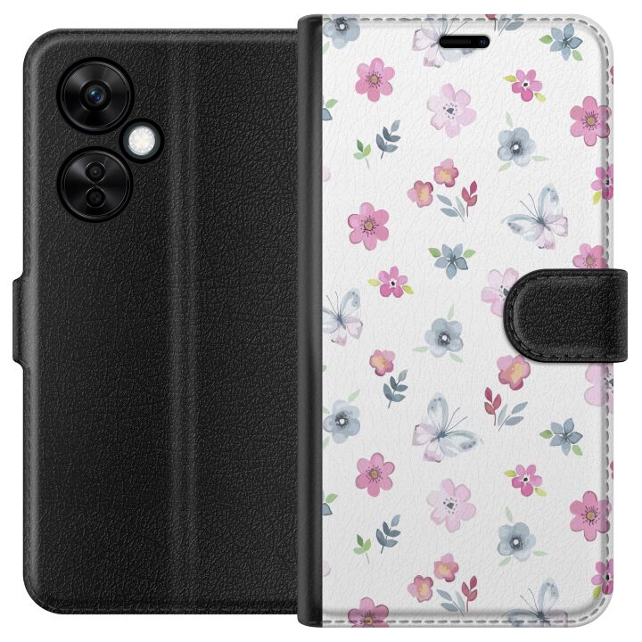 Plånboksfodral för Nord CE3 med Blommor och fjärillar -design. Fodralet kombinerar stil och funktion – ett slitstarkt mobilskal som skyddar mot repor och stötar samt praktiska kortfack på insidan.
