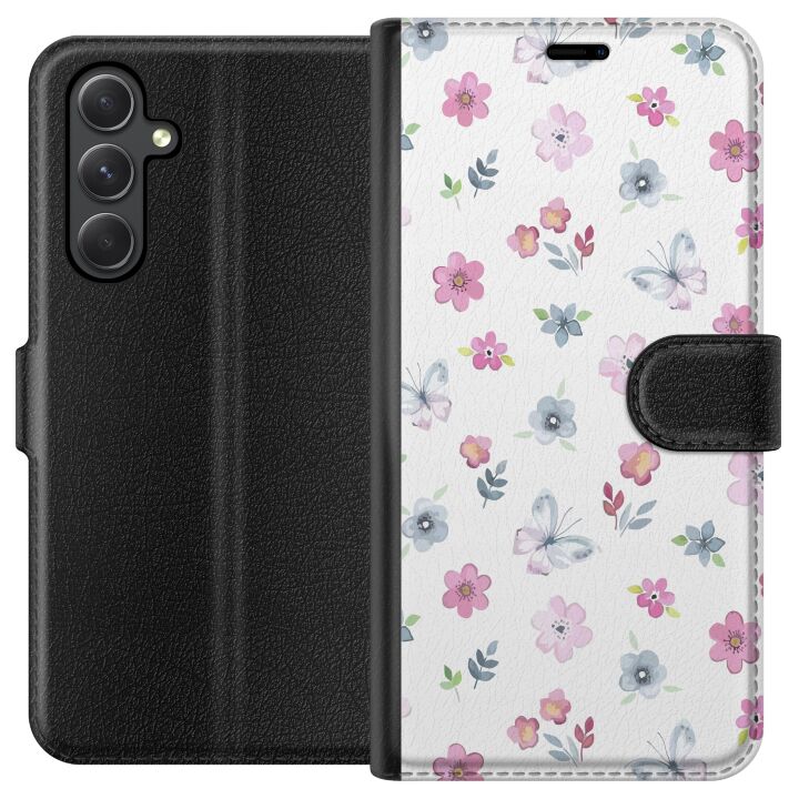 Plånboksfodral för Galaxy A05s med Blommor och fjärillar -design. Fodralet kombinerar stil och funktion – ett slitstarkt mobilskal som skyddar mot repor och stötar samt praktiska kortfack på insidan.
