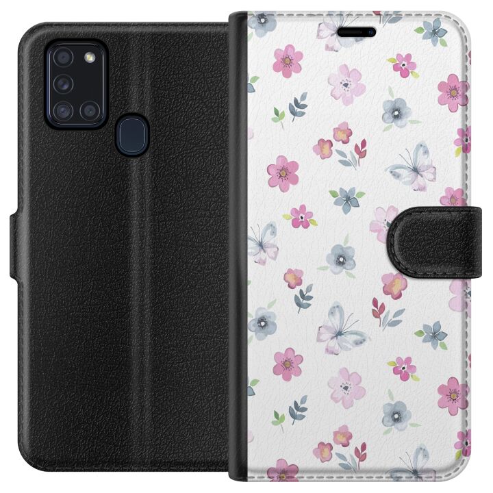 Plånboksfodral för Galaxy A21s med Blommor och fjärillar -design. Fodralet kombinerar stil och funktion – ett slitstarkt mobilskal som skyddar mot repor och stötar samt praktiska kortfack på insidan.