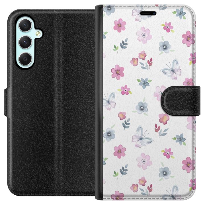 Plånboksfodral för Galaxy A34 med Blommor och fjärillar -design. Fodralet kombinerar stil och funktion – ett slitstarkt mobilskal som skyddar mot repor och stötar samt praktiska kortfack på insidan.
