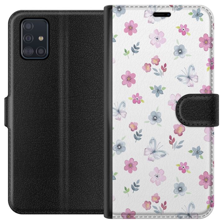 Plånboksfodral för Galaxy A51 med Blommor och fjärillar -design. Fodralet kombinerar stil och funktion – ett slitstarkt mobilskal som skyddar mot repor och stötar samt praktiska kortfack på insidan.