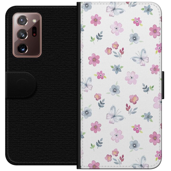Plånboksfodral för Galaxy Note20 Ultra med Blommor och fjärillar -design. Fodralet kombinerar stil och funktion – ett slitstarkt mobilskal som skyddar mot repor och stötar samt praktiska kortfack på insidan.