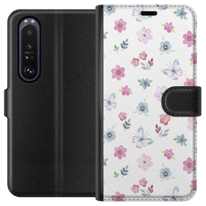 Plånboksfodral för Xperia 1 III med Blommor och fjärillar -design. Fodralet kombinerar stil och funktion – ett slitstarkt mobilskal som skyddar mot repor och stötar samt praktiska kortfack på insidan.